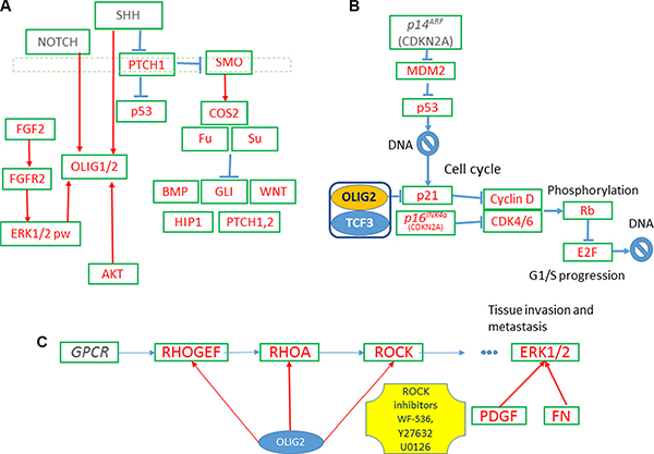Figure 1: OLIG2-related gene networks. (A) Expression of OLIG2 is inducted by SHH and FGF proteins. (B) OLIG2 cell cycle impact. (C) OLIG2 interacting with RHO pathway [41].