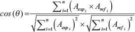 Where Aexp are the areas of either the endogenous or heavy XICs of selected product ions for a peptide measured in a sample, and Aref are the areas of the same XICs measured in a reference synthetic peptides mixture.