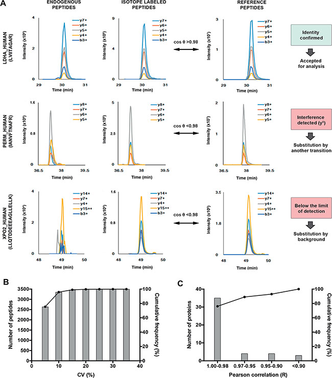Figure 3: Principle of PRM data quality control. (A) Peptide identity confirmation by comparison between PRM elution profiles of endogenous and internal standards of each biomarker candidate in the samples and a reference acquisition using the cosine of the spectral contrast angle (θ). A PRM measurement was accepted if the cos (θ) of both endogenous and internal standard are > 0.98. Values below 0.98 due to interferences were solved by the substitution of the interfered XICs. Values below 0.98 due to the limit of detection were substituted by background. (B) Reproducibility of the analytical workflow. The sample preparation was duplicated and the coefficient of variation (CV) was below 15% for 99% of the detected peptides. (C) Pearson correlation between signatures peptides coming from the same protein. The score below 0.90 for three proteins is due to isoform specific peptides.