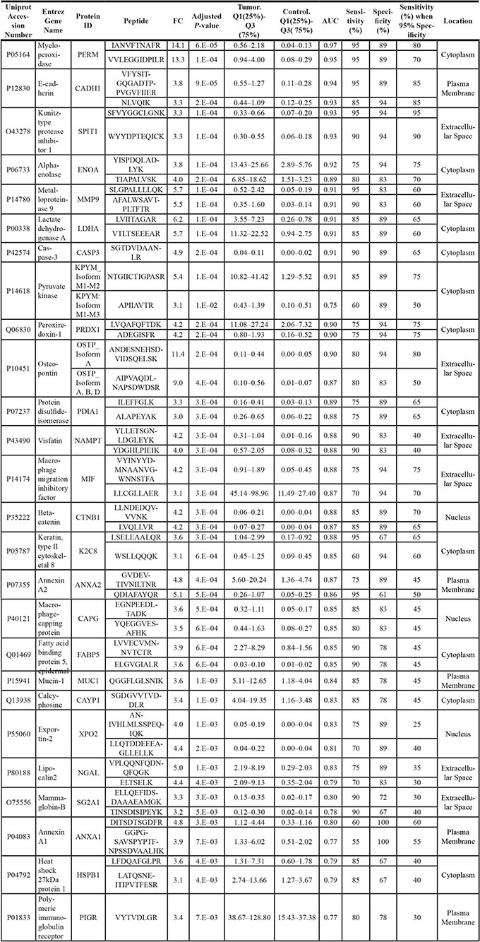 Based on the Bradford assays, 250 ng of the total protein concentration after albumin and IgGs depletion was injected for each sample. The constant amount of injected protein among samples was further confirmed by the integration of the total ion chromatogram of the MS1 scans, as shown in Supplementary Figure 2. After MS data curation, the relative levels (light/heavy ratios) of the final 98 monitored peptides in MS2 were subjected to Mann Whitney test for their comparison between tumor and control samples. Forty eight peptides corresponding to 26 proteins showed significant differences between the two groups with adjusted p-value < 0.05 (Benjamini corrected) and fold change greater than 3: PERM, CADH1, SPIT1, ENOA, MMP9, LDHA, CASP3, KPYM, PRDX1, OSTP, PDIA1, NAMPT, MIF, CTNB1, K2C8, ANXA2, CAPG, FABP5, MUC1, CAYP1, XPO2, NGAL, SG2A1, ANXA1, HSPB1, PIGR. All these proteins showed higher levels in tumor samples as compared to control samples (Table 1; Supplementary Figure 3).