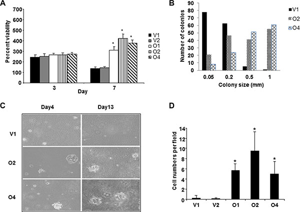 Figure 1: Overexpression of BP1 in MCF-7 cells is associated with aggressiveness. (A) Growth in the absence of serum. V1, O2 and O4 cell lines were grown without serum for seven days and cell number was measured using MTT assays. Data was normalized against day 0, which was set as 100%. Asterisks denote a statistical significance of p < 0.05 as compared to V1. (B) Colony formation in soft agar. V1, O2 and O4 cell lines were grown in soft agar as described in Materials and Methods. (C) Photomicrographs of cells grown in soft agar for four or 13 days. (D) Invasion of cells through Matrigel. BP1 overexpressing cell lines (O2 and O4) exhibited higher invasiveness compared to the empty vector control cell lines (V1) (p < 0.05). Three fields of unit area on each membrane were counted for cell numbers and the experiments were repeated twice.