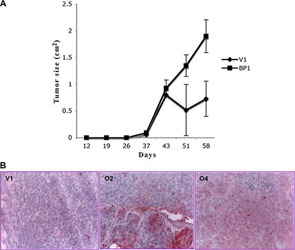 Figure 2: Tumor growth in mice is enhanced by increased BP1 expression. (A) Tumor size. Nude mice supplemented with a cholesterol-based estrogen pellet were injected in the cleared mammary fat pad with V1, O2 or O4 cell lines. Tumors were measured twice weekly and allowed to grow up to 58 days. (B) Immunostaining of tumors with anti-BP1 antibody. Anti-BP1 antibody was used to immunostain tumor sections. Since no tumors derived from V1 cells formed in the absence of an estrogen supplement, all sections are from estrogen supplemented mice. Figures are shown at 300X magnification.