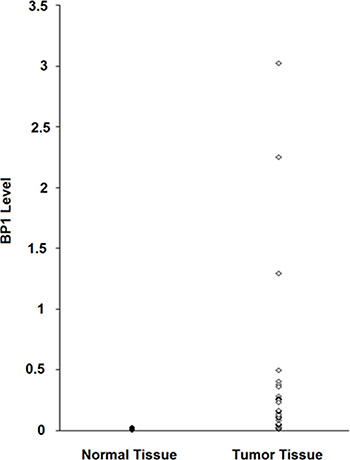 Figure 3: BP1 expression levels in breast tumors. RNA was extracted from 31 frozen tumors, followed by real-time PCR analysis. BP1 levels were normalized to 18S RNA. For comparison, RNA was extracted from five normal frozen breast tissues.