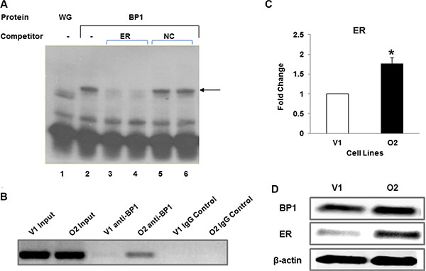 Figure 4: BP1 binds to and regulates ER. (A) Binding of BP1 to IVS1 of the estrogen receptor. Electrophoretic mobility shift assays were performed to detect potential binding of in vitro transcribed and translated BP1 to a consensus binding sequence located in IVS1 of the estrogen receptor. Binding of BP1 to a 32P end-labeled dsDNA probe containing the putative BP1 binding site and surrounding sequence is observed as a shifted band (arrow). Lane 1, wheat germ extract (WG) alone incubated with the probe. Lane 2, BP1 incubated with the probe. Lanes 3 and 4, unlabeled ER DNA (ER) was added to the incubation mixture containing BP1 protein at 500 X or 1000X molar excess, respectively. Lanes 5 and 6, a nonspecific negative control (NC) DNA to which BP1 protein does not bind was added at a 500 X or 1000X molar excess. (B) ChIP assay. DNA was precipitated using either the BP1 antibody (anti-BP1) or IgG negative control (IgG control) and whole DNA as positive control (input). The quantity of IVS1 DNA precipitated by BP1 antibody was compared in BP1 overexpressing cells (O2) and the empty vector (V1). (C) qRT-PCR. mRNA level of ER was measured by qRT-PCR comparing empty vector (V1) and BP1 overexpressor (O2) (*p < 0.01). Experiments were performed in triplicate. (D) Western blot analysis. Immunoblotting was performed with protein extracts from V1 and O2 cells as described in Materials and Methods.