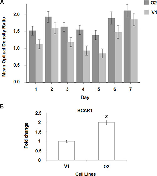 Real-time PCR was used to determine the levels of BCAR1 mRNA, a marker of tamoxifen resistance [19], comparing V1 and O2 cells. As can be seen from Figure 6B, BCAR1 expression was almost two fold higher in O2 than in V1 cells (p < 0.01).