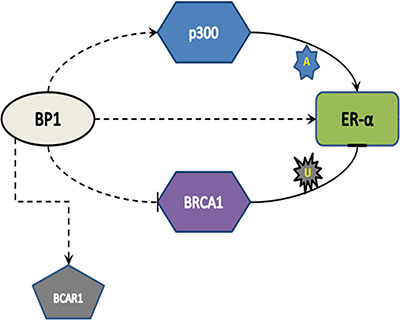 Figure 7: Model of BP1 regulation of ER. Dotted lines indicate a transcriptional mechanism, while solid lines indicate translational control (A: acetylation, U: Ubiquitination). BP1 binds to and activates EP300; p300 protein, which acetylates and “rescues” ER from BRCA1-mediated ubiquitination, is then up-regulated. Simultaneously, BP1 binds and transcriptionally activates ER. The increased ER protein expression and stability result in increased tamoxifen resistance.