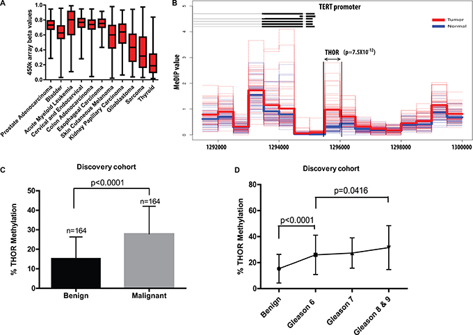 Figure 1: A region in the hTERT promoter (THOR) is specifically hypermethylated in malignant prostate tissues. (A) Illumina Infinium 450 k array data obtained from the The Genome Cancer Atlas shows high THOR methylation status (cg11625005) in multiple tumors. (B) Methylation values of 51 tumours (dotted red lines) and their average (thick red line) as well as the methylation values of 53 normal prostate samples and their average (blue) are shown for 500 bp wide regions in the proximity of the TERT promoter through MeDIP-seq analysis. The methylation differences are most significant in region chr5: 1295501–1296000 (Benjamini Hochberg corrected Mann-Whitney p-value: 7.547178e-12) which matches the THOR. (C) Pyrosequencing analysis reveals that levels of THOR methylation are significantly higher in malignant prostate tissue when compared to its corresponding normals. (D) Levels of THOR methylation are significantly higher between any subgroup of Gleason scores and normal tissue and increase with Gleason scores, with statistical differences between Gleason 6 and Gleason ≥ 8 (p = 0.0416).