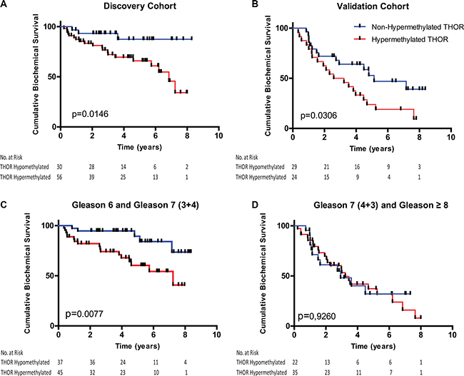 Figure 2: Levels of THOR methylation stratify prostate cancer patients. Biochemical recurrence reveals that patients from all Gleason scores (6, 7 and ≥ 8) with low levels of THOR methylation show significantly better biochemical progression free survival in both the discovery (A) and validation cohorts (B). Patients from both cohorts with Gleason 6 and intermediate risk (Gleason 7 (3 + 4)) and low THOR status present significantly better progression free survival when compared to patients with high levels of THOR methylation (C). Considering higher risk groups (Gleason 7 (4 + 3) and Gleason ≥ 8 patients)) the levels of THOR methylation did not show differences in terms of biochemical progression free survival (D).