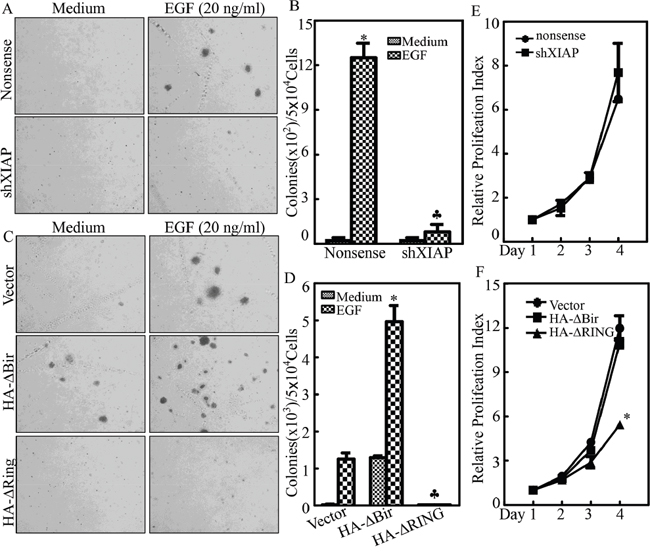Figure 2: XIAP RING domain upregulated EGF induced bladder cell transformation. A. and B. UROtsa(shXIAP) and UROtsa(Nonsense) cells were subjected to anchorage-independent assay in the presence or absence of EGF as indicated using the protocol described in the section of “Materials and Methods”. Representative images of colonies of UROtsa(shXIAP) and UROtsa(Nonsense) cells were captured under microscopy following 3 week incubation period; (A) the number of colonies was counted under microscopy and the results were presented as colonies per 50,000 cells from three independent experiments. The asterisk (*) indicates a significant increase in comparison to medium control and the symbol (♣) indicates a significant inhibition as compared with UROtsa(Nonsense) cells (p<0.05) (B). C. and D. UROtsa(Vector), UROtsa(HA-ΔBIR) or UROtsa(HA-ΔRING) cells were subjected to anchorage-independent assay in the presence or absence of EGF as indicated. Representative images of colonies of indicated cells were captured under microscopy following 3 week incubation period (C); the number of colonies was counted under microscopy and the results were presented as colonies per 50,000 cells from three independent experiments. The asterisk (*) indicates a significant increase as compared with UROtsa(Vector) cells, while the asterisk (♣) indicates a significant decrease as compared with UROtsa(Vector) cells (p<0.05) (D). E. and F. ATP assay to determine proliferation of cells was performed as indicated. The asterisk (*) indicates a significant inhibition as compared with UROtsa(Vector) cells.