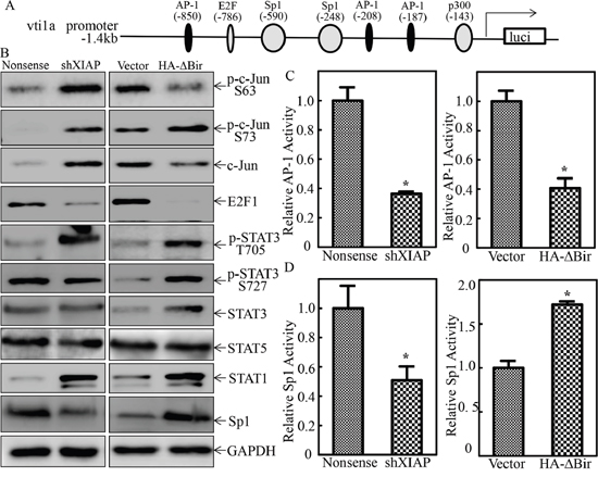 Figure 8: XIAP RING domain was crucial for Sp1 protein expression and transactivation in human bladder epithelial cells. A. The potential transcription factors binding sites of VTI1A promoter. B. The cell extracts obtained from UROtsa(Nonsense), UROtsa(shXIAP), UROtsa(Vector), and UROtsa(HA-ΔBIR) cells were subjected to Western Blot for determination of expression of p-c-Jun S63, p-c-Jun S73, c-Jun, E2F1, p-STAT3 705, p-STAT3 727, STAT3, STAT5, STAT1 and Sp1 as indicated. C. and D. UROtsa(Nonsense), UROtsa(shXIAP), UROtsa(Vector), and UROtsa(HA-ΔBIR) cells were co-transfected with AP-1 luciferase reporter or Sp1 luciferase reporter, together with pRL-TK. Twenty-four hours post transfection, the transfectants were extracted to evaluate the luciferase activity, with normalization to TK. The results were presented as luciferase activity relative to vector control transfectant. Each bar indicates mean±SD from three independent experiments. The symbol (*) shows a significant difference (P<0.05).