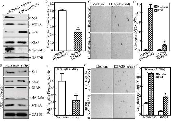 Figure 9: Sp1 was crucial for VTI1A transcription, p63α expression and EGF-induced malignant transformation of human bladder epithelial cells. A. The cell extracts obtained from UROtsa(Nonsense), and UROtsa(shSp1) were subjected to Western Blot for determination of expression of protein expression as indicated; B. UROtsa(Nonsense) and UROtsa(shSp1) were co-transfected with VTI1A promoter-driven luciferase reporter and pRL-TK. Twenty-four hours post transfection, the transfectants were extracted to evaluate the luciferase activity, with normalization to TK. The results were presented as luciferase activity relative to nonsense control transfectant. Each bar indicates mean±SD from three independent experiments. The symbol (*) shows a significant decrease as compared to UROtsa(Nonsense) cells (P<0.05); C. and D. UROtsa(Nonsense) and UROtsa(shSp1) were subjected to anchorage-independent growth in the presence or absence of EGF as indicated. Representative images of the colonies of indicated cells were captured under microscopy following 3 week incubation period (C); the number of colonies was counted under microscopy and the results were presented as colonies per 50,000 cells from three independent experiments. The asterisk (*) indicates a significant decrease as compared with the medium control, and the symbol (♣) indicates a significant inhibition in comparison to UROtsa(Nonsense) cells (p<0.05) (D). E. The cell extracts obtained from UROtsa(HA-ΔBIR/Nonsense), and UROtsa(HA-ΔBIR/shSp1) were subjected to Western Blot to determine expression of protein expression as indicated; F. UROtsa(HA-ΔBIR/Nonsense) and UROtsa(HA-ΔBIR/shSp1) were co-transfected with vti1a promoter-driven luciferase reporter and pRL-TK. Twenty-four hours post transfection, the transfectants were extracted to evaluate the luciferase activity, with normalization to TK. The results were presented as luciferase activity relative to nonsense control transfectant. Each bar indicates mean±SD from three independent experiments. The symbol (*) shows a significant decrease as compared to UROtsa(HA-ΔBir/Nonsense) cells (P<0.05); G. and H. UROtsa(HA-ΔBIR/Nonsense) and UROtsa(HA-ΔBIR/shSp1) were subjected to anchorage-independent growth in presence or absence of EGF as indicated. Representative images of colonies of indicated cells were captured under microscopy following 3 week incubation period (G); the number of colonies was counted under microscopy and the results were presented as colonies per 50,000 cells from three independent experiments. The asterisk (*) indicates a significant decrease as compared with the medium control, and the symbol (♣) indicates a significant inhibition in comparison to UROtsa(HA-ΔBIR/Nonsense) cells (p<0.05).
