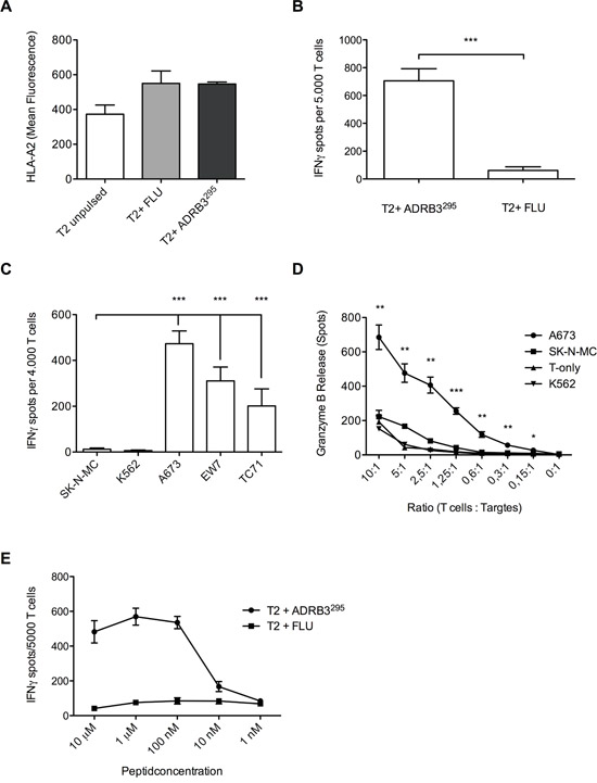 Figure 2: Wild type T cell clone ADRB3-1F4 specifically recognizes and kills HLA-A*02:01/ADRB3295 presenting ES cell lines. A. Flow-cytometry confirms HLA-A*02:01/ADRB3295 binding on T2 cells. ADRB3-1F4 shows peptide specificity and HLA-A*02:01 restriction against B. peptide loaded T2 cells and against C. HLA-A*02:01/ADRB3+ ES cell lines compared to controls in IFNγ ELISpot assays. D. Dose-dependent killing of HLA-A*02:01/ADRB3+ ES cell lines compared to controls determined by ELISpot granzyme B release. E. T cell clone ADRB3-1F4 recognizes ADRB3295 peptide pulsed on T2 cells in an IFNγ ELISpot assay in a dose dependent manner. IFNγ release diminishes at a threshold of <0.01 μM. Data are presented as mean and SEM. A673, EW7 and TC-71; HLA-A*02:01+ ES, SK-N-MC: HLA-A*02:01- ES, K562: MHC- NK cell control. Error bars represent standard deviation of triplicate experiments. Asterisks indicate significance levels. p values < 0.05 were considered statistically significant (*p < 0.05; **p < 0.005; ***p < 0.0005).