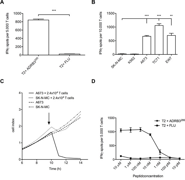 Figure 3: Functional evaluation of ADRB3295-TCR transgenic T cells. A. ADRB3295-TCR transgenic T cells specifically recognize ADRB3295 pulsed T2 cells and B. HLA-A*02:01/ADRB3+ ES cell lines in contrast to controls. C. ADRB3295-TCR transgenic T cells specifically kill HLA-A*02:01/ADRB3+ ES cell line A673 in an xCELLigence assay compared to controls. D. ADRB3295-TCR transgenic T cells recognize ADRB3295 peptide pulsed on T2 cells in an IFNγ ELISpot assay in a dose dependent manner. IFNγ release diminishes at a threshold of <0.01 μM. Data are presented as mean and SD. A673, EW7 and TC-71; HLA-A*02:01+ ES, SK-N-MC: HLA-A*02:01- ES, K562: MHC- NK cell control. E/T ratio for ELISpot assay: (A and D) 1:4, (B) 1:2. Error bars represent standard deviation of triplicate experiments. Asterisks indicate significance levels. *p < 0.05; **p < 0.005; ***p < 0.0005.