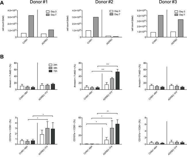 Figure 4: CD107a/annexin positivity is a sensitive early marker of ADRB3295-TCR transgenic T cell committed fratricide A. In PBMC donors #1 and #2 ADRB3295-TCR transgenic T cell expansion is hampered compared to CHM1319-TCR transgenic T cells as measured by total cell counts at expansion day 3 and day 7, respectively; B. Flow cytometry reveals correlation of CD107a/annexin expression with expansion impairment of ADRB3295-TCR transgenic T cells in contrast to CHM1319-TCR transgenic T cells. Asterisks indicate significance levels. *p < 0.05; **p < 0.005; ***p < 0.0005.