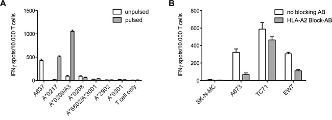 Figure 6: Various LCL cell lines and HLA-A*02 blocking of ES target cell lines to distinguish T cell cross-reactivity. A. Recognition of LCLs was limited to two lines expressing the HLA-A*02 superfamily. Further pulsing the cells with specific ADRB3295 peptide also gave no further hints for cross-reactivity. ES cell line A673 served as a positive control. B. Blocking of the HLA-A*02 molecules on ES cell lines shows reduced IFNγ release in ELISpot assays. E/T ratio for ELISpot assay: 1:2. Error bars represent standard deviation of triplicate experiments.