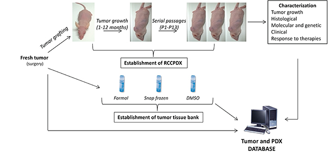 We xenografted in nude mice 336 RCC tumors of all subtypes and stages obtained from patients at the time of surgery from which we developed 30 models (P3 and above). It took up to 24 months to develop such model. We demonstrated that these models grow after both subcutaneous and orthotopic implantation, and are stable at the (i) histologic, (ii) genetic and (iii) molecular levels.