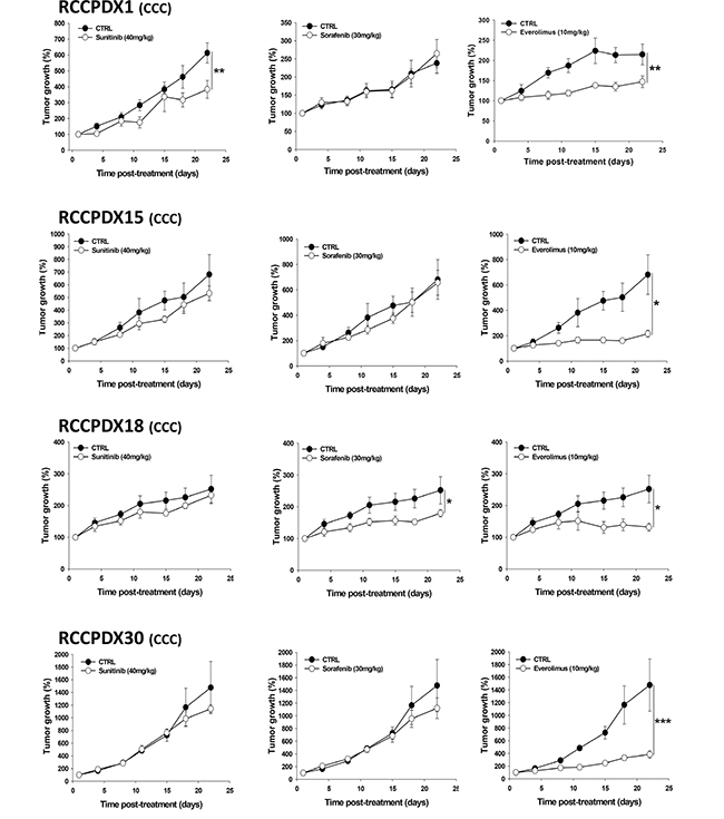 Figure 5: In vivo growth curves of 4 RCCPDX tumors of the CCC subtype treated with sunitinib, sorafenib or everolimus for the indicated time period. Results are expressed in % from day 1 and as mean +/- sem, n=4 to 5 for each curve. *, P<0.05; **, P<0.01; ***, P<0.001 comparing treated to control groups. Note: mice were divided into four groups, the control and the treated groups i.e. one group for each compounds tested, except for RCCPDX1 where mice were divided into two groups, the control and the treated group for each compound tested.