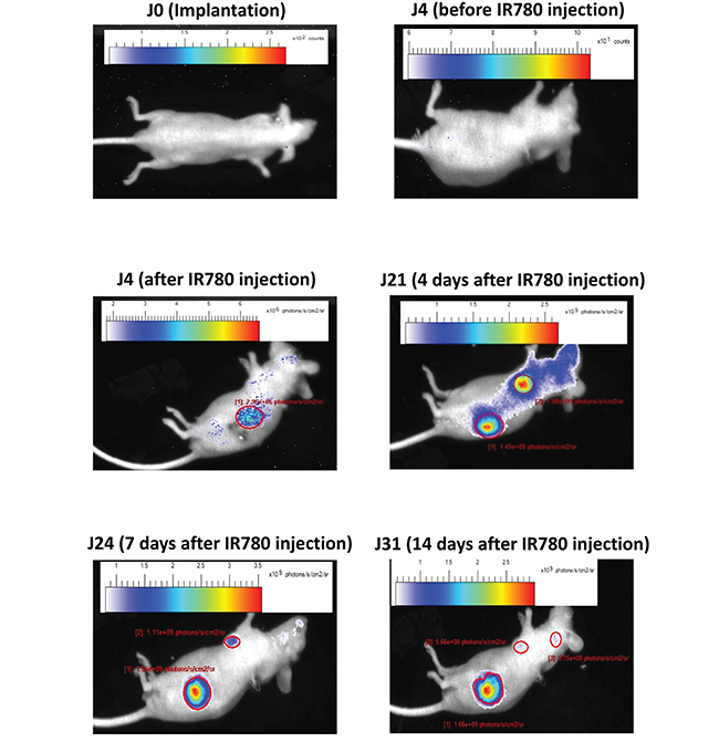 Primary tumors and metastasis were monitored during one month following implantation (Figure 6). No signal was observable before IR780 injection. In the model shown, RCCPDX20, primary tumor and lung metastasis were observed 3 weeks post-implantation; 4 weeks post-implantation, we also observed brain metastasis. These data indicate that during passages in mice, tumor tissues conserved their ability to invade, and at classical metastatic localizations.