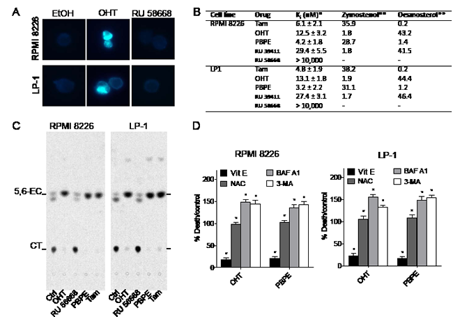 Figure 3: OHT and AEBS ligands induce the accumulation of cholesterol precursors in HMCLs. A) RPMI 8226 and LP-1 cells were treated with EtOH or OHT (10 μM) for 48 h and cytospinned. Slides were stained with filipin and analyzed. Cells containing free sterols are colored in blue. Cells were visualized in the ultraviolet range using a x40 objective on a Zeiss LSM 510 microscope (Göettingen, Germany). B) The sterols accumulated in RPMI 8226 and LP-1 cells after 48 h incubation with SERMs, SERDs and selective AEBS/ChEH ligands were determined and quantified. Analyses were performed by HPLC and GC/MS as described in the Methods section. The cholesterol intermediates were quantified as a percent by the weight of total sterol. The amount of zymostenol and desmosterol was quantified by references to an external standard. C) HMCLs were treated with EtOH, OHT (10 μM), Tam (10 μM), RU 58668 (10 μM) or PBPE (40 μM) for 24 h and incubated with 0.6 μM [14C]-EC for 48 h and ChEH activity was assayed by measuring the conversion of CE into CT by TLC. A representative autoradiogram from three independent experiments is shown. D) RPMI 8226 and LP-1 cells were pre-incubated with 500 µM Vit E, 1 mM NAC, 50 nM BAF A1 or 10 mM 3-MA and then challenged with OHT (10 μM) or PBPE (40 µM) for 72 h. Cell death was determined by Trypan blue exclusion. Data were expressed as the percentage of cell death relative to control cells that received OHT (10 μM) or PBPE (40 µM). Experiments were repeated three times in duplicate with comparable results. The data present ed here are the means ± SEM of all experiments. *, p<0.001.