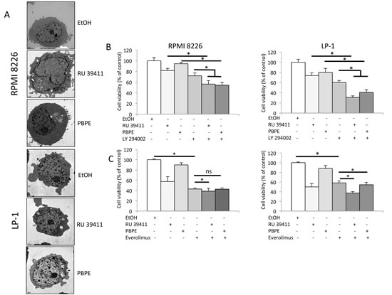Figure 4: AEBS ligands induce PI3K/AKT/mTOR-mediated autophagy in HMCLs. A) HMCLs were treated with RU 39411 (10 μM) or PBPE (40 μM) for 24 h and analyzed by transmission electron microscopy. B) and C) RPMI 8226 and LP-1 cells were cultured with (or without) 1 µM LY 294002 for 2 h (B), or 10 nM everolimus (RAD 001) for 2 h (C) then treated (or not) with 10 µM RU 39411 or 40 µM PBPE for 24 h (B) or 48 h (C). The number of viable cells was then determined with a MTT assay. Each experimental condition was repeated five times; the experiment was repeated three times. Plotted values (mean ± SD) are the percentage of viable cells referring to control experiments assigned to 100%. * p<0.05; ns, not significant.