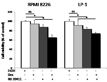 Figure 5: AEBS ligand alleviates dexamethasone resistance. RPMI 8226 and LP-1 cells were cultured with vehicle (EtOH), RU 39411 (10 µM for 2 h or not) and then with 10 µM dexamethasone (Dex) for 24 h. The number of viable cells was then determined with a MTT assay. Each experimental condition was repeated three times. Plotted values (mean ± SD) are the percentage of viable cells referring to control experiments assigned to 100%. * p<0.05; ns, not significant.