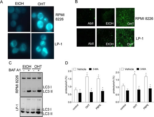 Figure 2: OHT-treatment induces ACD in MM cells. A) Exponentially growing RPMI 8226 and LP-1 cells were treated with EtOH as vehicle or OHT at 10 μM for 24 h and stained with MDC. MDC-positive vesicles were observed with a confocal microscope (x400 magnification). B) Cells were treated with EtOH or OHT (10 μM) for 24 h and analyzed by transmission electron microscopy. C) RPMI 8226 and LP-1 cells were treated for 6 h with 10 μM OHT or vehicle, then subjected to immunocytochemistry with AbII alone as control or anti-LC3 Ab. Slides were analyzed by confocal microscopy (x180 magnification). D) RPMI 8226 and LP-1 cells were treated with 10 μM OHT (or EtOH) for 48 h followed by BAF A1 for 4 h (+) or not (-). Whole cell lysates were then analyzed by Western blotting with anti-LC3 Ab. D) Degradation of long-time proteins was determined in RPMI 8226 and LP-1 treated with EtOH, 10 µM OHT, 40 µM PBPE or 10 µM RU 58668 for 18 h in the presence or in the absence of 10 mM 3-MA. Experiments were repeated at three times in duplicate with comparable results. The data presented here are the means ± SEM of all experiments. *, p<0.001.