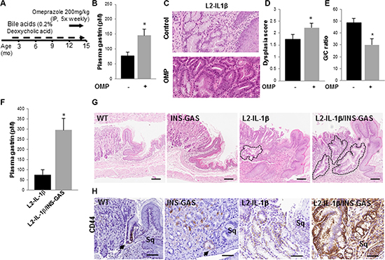 Figure 1: Hypergastrinemia accelerates Barrett’s-like esophagus in L2-IL-1β mice. (A) Schematic for omeprazole (OMP) treatment in wild type and L2-IL-1β mice. Mice were started on deoxycholic acid (0.2%) in their drinking water at 8 weeks of age, and then given omeprazole 200 mg/kg intraperitoneally 5 days a week, from 12 – 15 months of age. (B) Gastrin levels (pM) in L2-IL-1β mice (N = 5) and L2-IL-1β mice treated with omeprazole (N = 5) (p = 0.037).(C) Representative H&E stained sections from BE-like lesions at the SCJ of control and omeprazole-treated L2-IL-1β mice. (D) Dysplasia scores of BE-like lesions in control (N = 5) and OMP-treated (N = 5) L2-IL-1β mice (p < 0.05). (E) Goblet-like cell to columnar cell (GC) ratio from BE-like lesions in control (N = 5) and OMP-treated (N = 5) L2-IL-1β mice (p < 0.05). (F) Plasma gastrin levels (pM) in L2-IL-1β mice (N = 3) and L2-IL-1β/INS-GAS mice (N = 6) (p = 0.03). (G) H&E stained histological sections from the SCJ from wild type, INS-GAS, L2-IL-1β, L2-IL-1β/INS-GAS mice at 12 months of age. Outlined areas indicate BE mucinous metaplasia at the SCJ. Scale bars = 100 um. (H) CD44 immunostaining of cardia cells in WT, INS-GAS, L2-IL-1β, L2-IL-1β/INS-GAS mice. Scale bars = 100 um.
