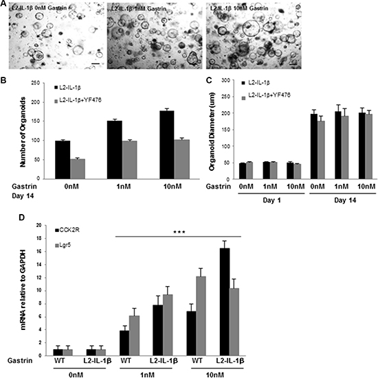 Figure 4: Gastrin promotes cardia organoid growth through CCK2R. (A) Organoids grown from the gastric cardia of L2-IL-1β mice in 0 nM, 1 nM, 10 nM gastrin for 14 days. Scale bars =100 um. (B) Quantification of organoid number after 14 days of growth in 0 nM, 1 nM, or 10 nM gastrin (*p = 0.01 0 nM vs 10 nM gastrin) from the gastric cardia L2-IL-1β mice. Treatment with YF476 (12 mg/mL) blocked the effect of gastrin on organoid number (p < 0.05 for all three gastrin doses). (C) Quantification of organoid diameter at day 1 and day 14 of growth in 0 nM, 1 nM, or 10 nM gastrin, in L2-IL-1β mice, with or without YF476 (12 mg/mL). YF476 had no effect on organoid diameter. (D) RT-PCR for CCK2R or Lgr5 from organoids of WT or L2-IL-1β cardia grown for 14 days in 0 nM, 1 nM or 10 nM gastrin. (***p < 0.001 for all 4 dataset points: 1 nM gastrin WT and L2-IL-1β when compared to 0 nM gastrin WT and L2-IL-1β for CCK2R and Lgr5, respectively; and for 10 nM gastrin WT and L2-IL-1β when compared to 0 nM gastrin WT and L2-IL-1β for CCK2R and Lgr5, respectively).