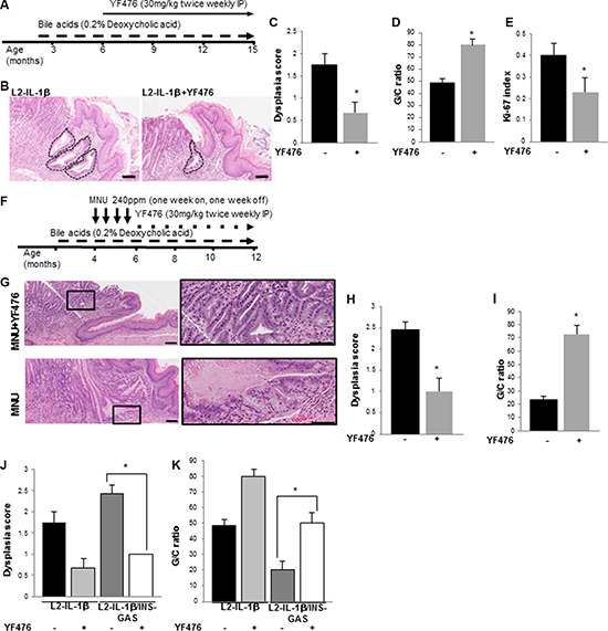 L2-IL-1β mice treated with bile acids and MNU develop dysplastic lesions at an earlier age than mice treated with bile acids alone, and thus MNU/bile acid-treated L2-IL-1β mice were also treated with YF476 or vehicle (Figure 5F). YF476 prevented the development of advanced dysplasia and markedly increased the mucus cell (G/C) ratio compared to controls (Figure 5G–5I). Furthermore, when L2-IL-1β/INS-GAS mice were treated with YF476, the dysplasia score in L2-IL-1β/INS-GAS mice was decreased and the mucus cell (G/C) ratio increased, indicating a strict dependence on CCK2R activation in these mouse phenotypes (Figure 5J, 5K).
