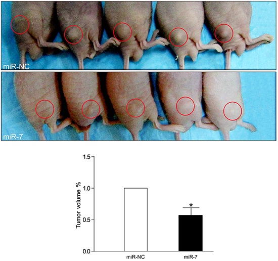 Figure 4: miR-7 inhibits VemR A375 melanoma tumor growth in vivo. VemR A375 melanoma cells (2 × 105) were transfected with miR-NC or miR-7 mimics and then injected subcutaneously to athymic nude mice (n = 5 for each group). One week later, cohorts of mice from each group were sacrificed to determine the tumor volume. The in vivo experiment was repeated twice. Representation (up) and quantification (down) of xenograft tumors formed by subcutaneous injection of VemR A375 melanoma cells stably transfected with miR-NC or miR-7 mimics. *p < 0.05.
