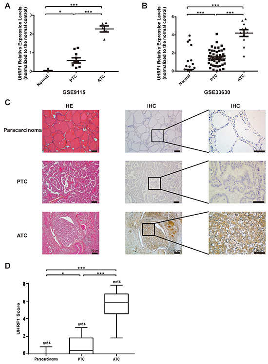 Figure 1: UHRF1 was highly expressed in ATC, compared with paracarcinoma and PTC. A. and B. Relative expression levels of UHRF1 in microarray data GSE9115 (A) and GSE33630 (B), which were normalized to the respective normal controls. *p<0.05, ***p<0.001, two-tailed Student’s t-test. C. Paracarcinoma tissue, PTC samples and ATC samples were collected and subjected to HE staining and IHC assay with an UHRF1 antibody. Scale bar, 50 μm. D. Expression level of URHF1 was compared among paracarcinoma tissue, PTC and ATC samples. Scores were determined as described in the MATERIALS AND METHODS and normalized to the control. *p<0.05, ***p<0.001, two-tailed Student’s t-test.