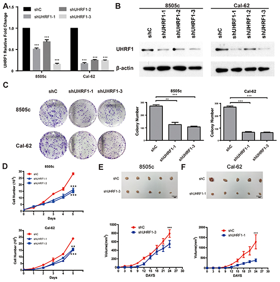 Figure 2: Suppression of UHRF1 inhibits the proliferation ability of thyroid cancer cells in vitro and in vivo. A. ATC cell lines, 8505c and Cal-62, were stably transfected with shRNAs or a vector control. Real-time RT-PCR was used to validate UHRF1 expression. (***p<0.001 by two-tailed Student’s t test). B. Western blot was used to validate the protein expression of UHRF1. C. The proliferation capacity of constructed stable cell lines 8505c and Cal-62 were analyzed by colony formation assay. Representative pictures of the whole plates from triplicate experiments are shown. Error bars indicate mean ± SD (**p<0.01, ***p< 0.001 by two-tailed Student’s test). D. Approximately 1×105 cells were seeded in each well of six-well plates. Cells were collected and counted by hemocytometer every 24 hours. All experiments were performed in triplicate. Error bars indicate mean ± SD, ***p< 0.001 by two-tailed Student’s t test. E. and F. Nude mice were injected with 8505c shC, 8505c shUHRF1-3 (E), Cal-62 shC and Cal-62 shUHRF1-1 (F). Tumors were removed after 24 days. The average sizes of xenograft tumors measured every 3 days (n=5, error bars indicate mean ± SD, ***p< 0.001 by two-tailed Student’s t test). Scale bar, 10 mm.
