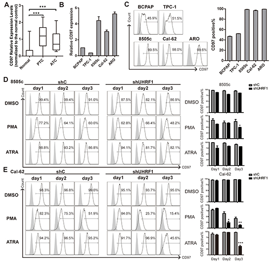Figure 4: UHRF1 suppression combined with PMA or ATRA treatment effectively down-regulates the dedifferentiation marker CD97. A. CD97 Relative Expression Levels in microarray data GSE33630, which were normalized to the normal controls. (***p<0.001, values were calculated by two-tailed Student’s test). B. mRNA expression of PTC cell lines (BCPAP and TPC-1) and ATC cell lines (8505c, Cal-62 and ARO) were assayed by real-time RT-PCR. C. Five thyroid cancer cell lines were collected for flow cytometric analysis to measure the CD97 positive population. The right panel shows the statistical results of the CD97 positive percentage measurement. The data are presented as mean ± SD of three independent experiments. D. and E. Stable cell lines, 8505c shC, 8505c shUHRF1-3(D), Cal-62 shC and Cal-62 shUHRF1-1 (E) were treated with DMSO, PMA (10 ng/ml) or ATRA (1μM) for the indicated time. Adherent cells were then subjected to flow cytometric analysis to measure the CD97 population. The right panel shows the statistical results of the CD97 positive percentage measurement. Error bars represent mean ± SD of three independent experiments (*p<0.05, **p<0.01, ***p<0.001 by two-tailed student’s t test).