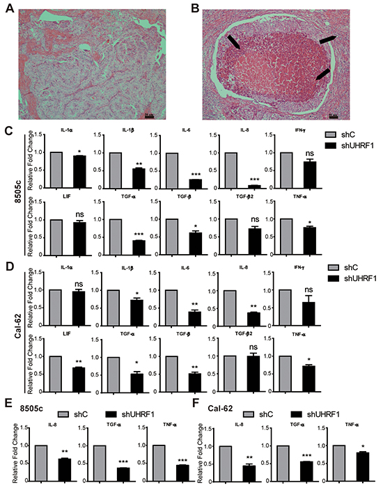 Figure 5: Down-regulated UHRF1 suppresses the inflammatory reaction of ATC. A. and B. HE staining of PTC (A) and ATC (B). Arrows are indicated the immersed lymphocytes. Scale bar, 50 μm. C. and D. Validation of gene expression between shC and shUHRF1 in 8505c (C) or Cal-62 (D) cell lines by real-time RT-PCR. (*p<0.05, **p<0.01, ***p<0.001 by two-tailed student’s t test). E. and F. Validation of IL-8, TGF-α and TNF-α expression between shC group and shUHRF1 group in 8505c (E) or Cal-62 (F) xenograft tumor tissue by real-time RT-PCR. (*p<0.05, **p<0.01, ***p<0.001 by two-tailed student’s t test).