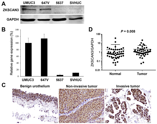Figure 1: ZKSCAN3 expression in bladder cancer. A. Western blotting of ZKSCAN3 in urothelial cell lines. Total protein extracted from each cell line was immunoblotted for ZKSCAN3 (60 kDa). GAPDH (37 kDa) served as an internal control. B. Quantitative RT-PCR of ZKSCAN3 in urothelial cell lines. Total RNA isolated from each cell line was subjected to real-time RT-PCR. Expression of ZKSCAN3 gene was normalized to that of GAPDH. Transcription amount is presented relative to that in UMUC3. Each value represents the mean (+SD) from at least three independent experiments. C. IHC of ZKSCAN3 in non-neoplastic urothelium, non-invasive urothelial tumor, and invasive urothelial tumor specimens. Original magnification, ×400. D. Quantitative RT-PCR of ZKSCAN3 in non-neoplastic urothelium and urothelial tumor specimens. Expression of ZKSCAN3 gene was normalized to that of GAPDH.