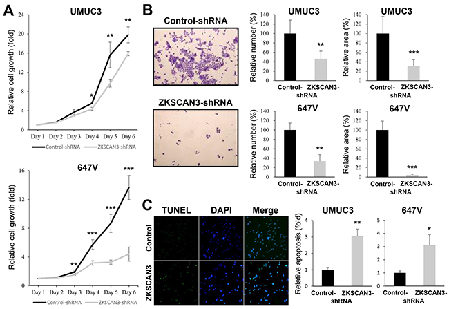 Figure 3: Effects of ZKSCAN3 inactivation on bladder cancer cell proliferation. A. MTT assay in UMUC3-control-shRNA/ZKSCAN3-shRNA and 647V-control-shRNA/ZKSCAN3-shRNA cultured for 1-6 days. Cell viability is presented relative to that of each control line at day 1. Each value represents the mean (±SD) from at least three independent experiments. B. Clonogenic assay in UMUC3-control-shRNA/ZKSCAN3-shRNA and 647V-control-shRNA/ZKSCAN3-shRNA. The number of colonies and their areas quantitated, using the ImageJ software, are presented relative to those of each control line. Each value represents the mean (+SD) from at least three independent experiments. C. TUNEL assay in UMUC3-control-shRNA/ZKSCAN3-shRNA and 647V-control-shRNA/ZKSCAN3-shRNA. Apoptosis is presented relative to that of each control line. Each value represents the mean (+SD) from at least three independent experiments. *P<0.05 (vs. control-shRNA). **P<0.01 (vs. control-shRNA). ***P<0.001 (vs. control-shRNA).