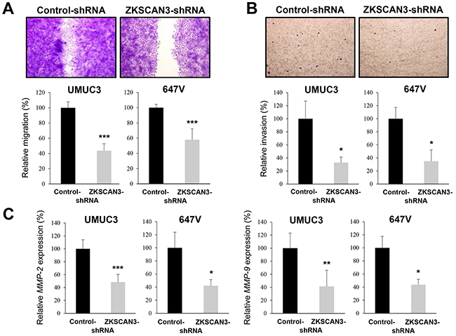 Figure 4: Effects of ZKSCAN3 inactivation on bladder cancer cell migration and invasion. A. Wound healing assay in UMUC3-control-shRNA/ZKSCAN3-shRNA and 647V-control-shRNA/ZKSCAN3-shRNA. The cells grown to confluence were gently scratched and the wound area was measured after 24-hour culture. The migration determined by the rate of cells filling the wound area is presented relative to that of each control line. Each value represents the mean (+SD) from at least three independent experiments. B. Transwell invasion assay in UMUC3-control-shRNA/ZKSCAN3-shRNA and 647V-control-shRNA/ZKSCAN3-shRNA cultured in the Matrigel-coated transwell chamber. The number of invaded cells present in the lower chamber was counted under a light microscope (100× objective in five random fields). Cell invasion is presented relative to that of each control line. Each value represents the mean (+SD) from three independent experiments. C. Quantitative RT-PCR of MMP-2 and MMP-9 in UMUC3-control-shRNA/ZKSCAN3-shRNA and 647V-control-shRNA/ZKSCAN3-shRNA. Expression of each specific gene was normalized to that of GAPDH. Transcription amount is presented relative to that of each control line. Each value represents the mean (+SD) from at least three independent experiments. *P<0.05 (vs. control-shRNA). **P<0.01 (vs. control-shRNA). ***P<0.001 (vs. control-shRNA).