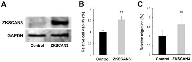 Figure 5: Effects of ZKSCAN3 overexpression on bladder cancer cell proliferation and migration. A. Western blotting of ZKSCAN3 in 5637-control and 5637-ZKSCAN3 cells. Cell extracts were immunoblotted for ZKSCAN3 (60 kDa). GAPDH (37 kDa) served as an internal control. B. MTT assay in 5637-control and 5637-ZKSCAN3 cells cultured for 6 days. The viability of 5637-ZKSCAN3 cells is presented relative to that of 5637-control cells. Each value represents the mean (+SD) from at least three independent experiments. C. Wound healing assay in 5637-control and 5637-ZKSCAN3 cells. The cells grown to confluence were gently scratched and the wound area was measured after 24-hour culture. The migration of 5637-ZKSCAN3 determined by the rate of cells filling the wound area is presented relative to that of 5637-control. Each value represents the mean (+SD) from at least three independent experiments. **P<0.01 (vs. control).