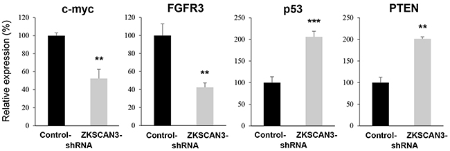 Figure 7: Effects of ZKSCAN3 inactivation on the expression of oncogenes and tumor suppressor genes. Quantitative RT-PCR of c-myc, FGFR3, p53, and PTEN in UMUC3-control-shRNA and UMUC3-ZKSCAN3-shRNA cells. Expression of each specific gene was normalized to that of GAPDH. Transcription amount is presented relative to that of UMUC3-control line. Each value represents the mean (+SD) from at least three independent experiments. **P<0.01 (vs. control-shRNA). ***P<0.001 (vs. control-shRNA).
