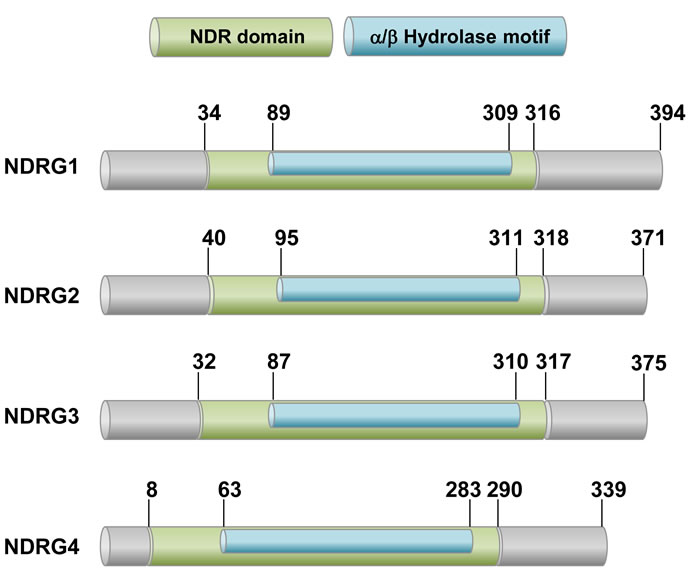 Figure 1: A schematic drawing of human NDRG proteins. The NDRG family members are 53-65% homologous to each other and share the conserved NDR domain, which includes the alpha/beta hydrolase motif. However, they have no hydrolase activity due to lack of amino acid residues critical for catalytic reaction.