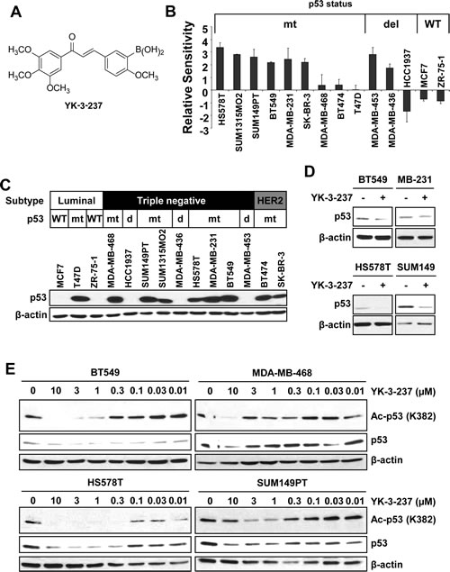 Figure 1: YK-3-237 reduces the proliferation and acetylation of mtp53 in breast cancer cell lines. A, structure of YK-3-237. B, relative sensitivities of breast cancer cell lines to YK-3-237. Breast cancer cells were treated with increasing amount of YK-3-237 for ~72 hr and the viable cells were measured by MTT assay. Relative sensitivities were calculated as described in Materials and Methods. The EC50 value of each cell line was plotted in Sup Figure 1. Data are presented as mean ± SEM from two independent experiments performed in triplicate. C, western blot analysis of breast cancer cell lines. Cell lysates from each cell line were analysed by indicated antibodies. D, effect of YK-3-237 on the level of mtp53. Cells were treated with 1 µM of YK-3-237 for 24 hr and western blot analysis was performed with indicated antibodies. E, YK-3-237 reduces acetyl-mtp53. Cells were treated with increasing concentrations of YK-3-237 for 24 hr and cell lysates were subjected to western blot analysis with indicated antibodies. C~E, β-actin was used as a loading control.