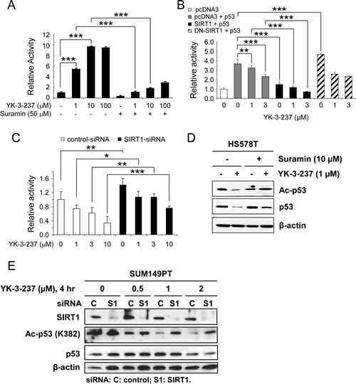 Figure 2: The effect of YK-3-237 on the activity of SIRT1. A, the effect of YK-3-237 on the enzyme activity of purified human SIRT1 enzyme in vitro. SIRT1 enzyme assay was performed as described in the Materials and Methods. Data are presented as mean ± SD. *** P < 0.001. B, the effect of YK-3-237 on the SIRT1-mediated repression of WTp53 transcriptional activity. MCF7 cells were transfected with indicated plasmid DNAs and further treated with YK-3-237 for 24 hr. Luciferase reporter activity was measured as described in the Materials and Methods. Data are presented as mean ± SD. **P < 0.01 and ***P < 0.001. C, SIRT1-KD reverses the YK-3-237-mediated repression of WTp53 transcriptional activity. MCF7 cells were transfected with siRNA and p53-Luc and further treated with YK-3-237 for 24 hr. Relative luciferase activity was determined as in B. Data are presented as mean ± SD.*P < 0.05, **P < 0.01, and *** P < 0.001. D, suramin reduces the YK-3-237-mediated deacetylation of mtp53. HS578T cells, pretreated with suramin for 1 hr, were further treated with YK-3-237 for 23 hr. Western blot analysis was performed as indicated. β-actin was used as a loading control. E, the effect of YK-3-237 on the SIRT1-mediated deacetylation of mtp53. SUM149PT cells were transfected with either control (C)- or SIRT1 (S1)-siRNA for 3 days, re-seeded and further treated with YK-3-237 for 4 hr. Western blot analysis was conducted with indicated antibodies. β-actin was used as a loading control.