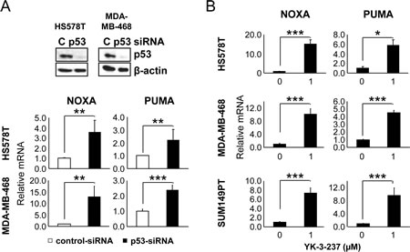Figure 3: The effect of mtp53 depletion and YK-3-237 on the expression of WTp53-target genes in TNBC cell lines. A, the effect of mtp53 knockdown on the expression of WTp53-target genes. Cells were transfected with either control (C)- or p53-siRNA and subjected to quantitative real time-PCR (qRT-PCR) as described in Materials and Methods. Data are shown as mean ±SD. Knockdown of mtp53 was assessed by western blot analysis.**P < 0.01 and ***P < 0.001. B, qRT-PCR analysis of WTp53-target genes in cells treated with YK-3-237. Cells were treated with YK-3-237 for 24 hr and qRT-PCR was performed as in A. Data are presented as mean ±SD. *P < 0.05 and ***P < 0.001.