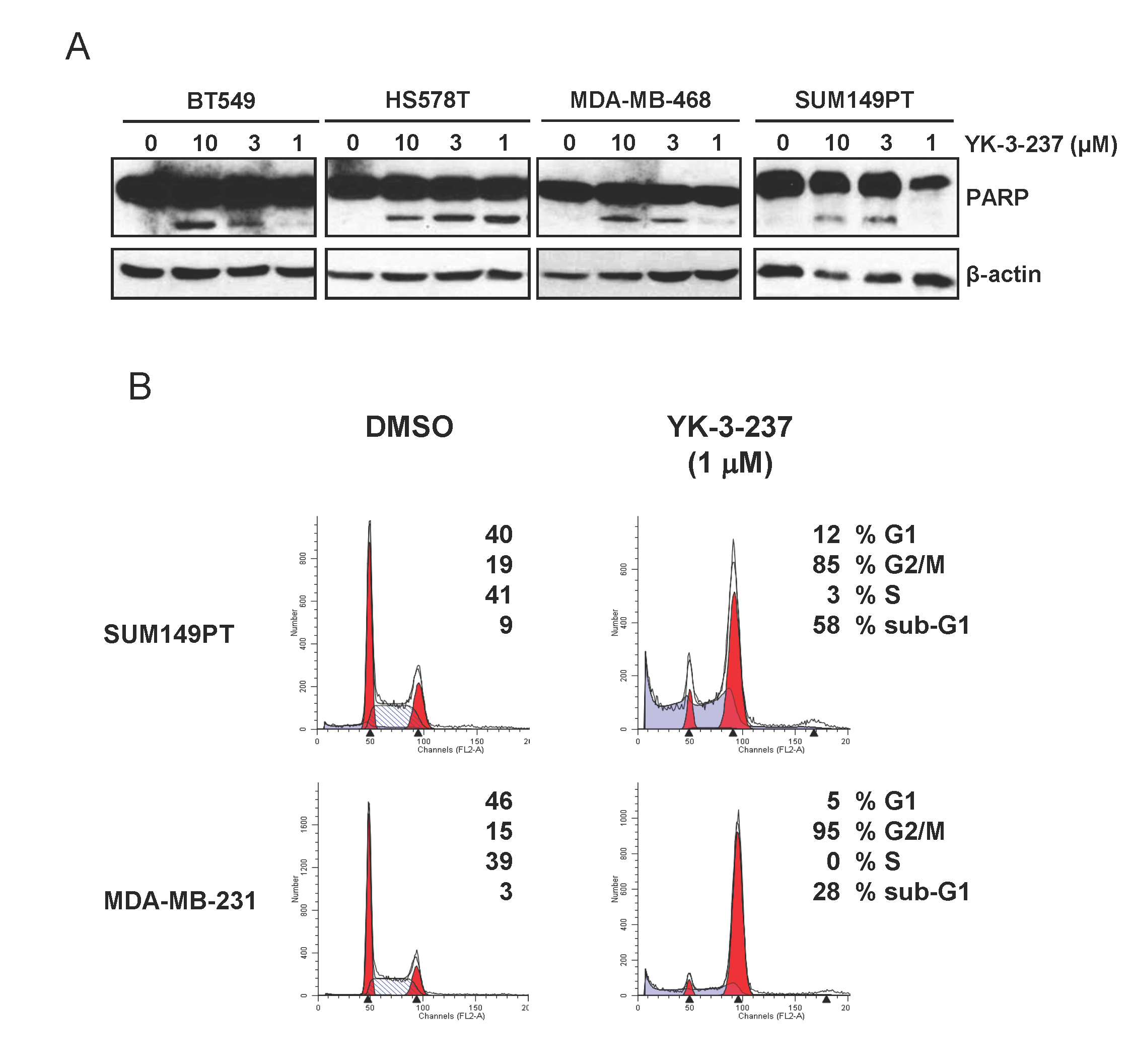 Figure 4: Induction of apoptotic cell death and G2/M arrest by YK-3-237 in TNBC cell lines. Cells were treated with YK-3-237 for 24 hr and both floating and attached cells were harvested for western blot analysis (A) and cell cycle analysis (B). In A, β-actin was used as a loading control.