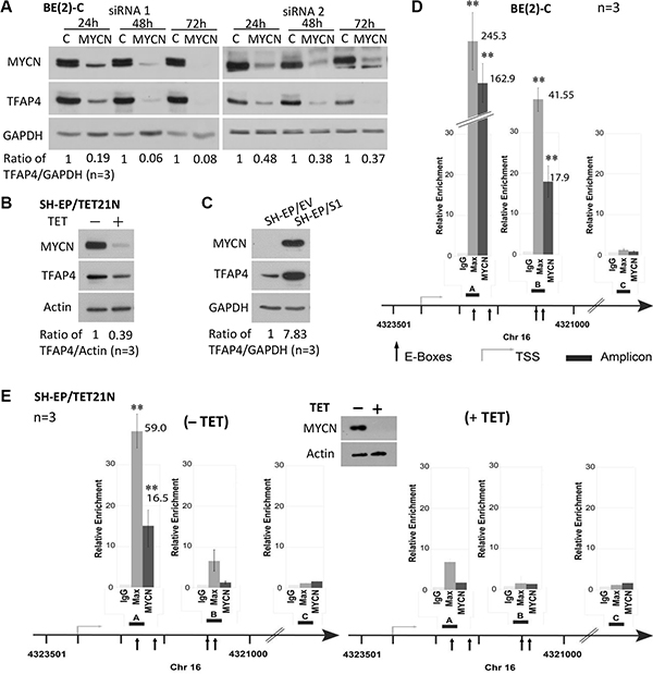 Figure 1: TFAP4 is regulated by MYCN in neuroblastoma cells. Suppression of MYCN resulted in down-regulation of TFAP4 in BE(2)-C cells (A). TFAP4 expression levels paralleled MYCN expression in SH-EP/TET21/N cells (MYCN Tet-Off system, 24 hours) (B) and in neuroblastoma SH-EP/S1 cells constitutively expressing exogenous MYCN compared with SH-EP/EV controls (C). GAPDH or Actin served as protein loading controls on Western blot. Quantitative ChIP assays in BE(2)-C cells (D) and SH-EP/TET21/N cells expressing MYCN (E) or treated with tetracycline (TET) for 48 h (E) demonstrated that MYCN directly binds to two E-box sites (amp A and B) located in the first intron of the TFAP4 gene, but not the control region (amp C). Western blot confirmed repression of MYCN expression with tetracycline treatment (E, inset). Mean ± SE (n = 3). amp, amplicon; TSS, transcription start site. **P < 0.01.