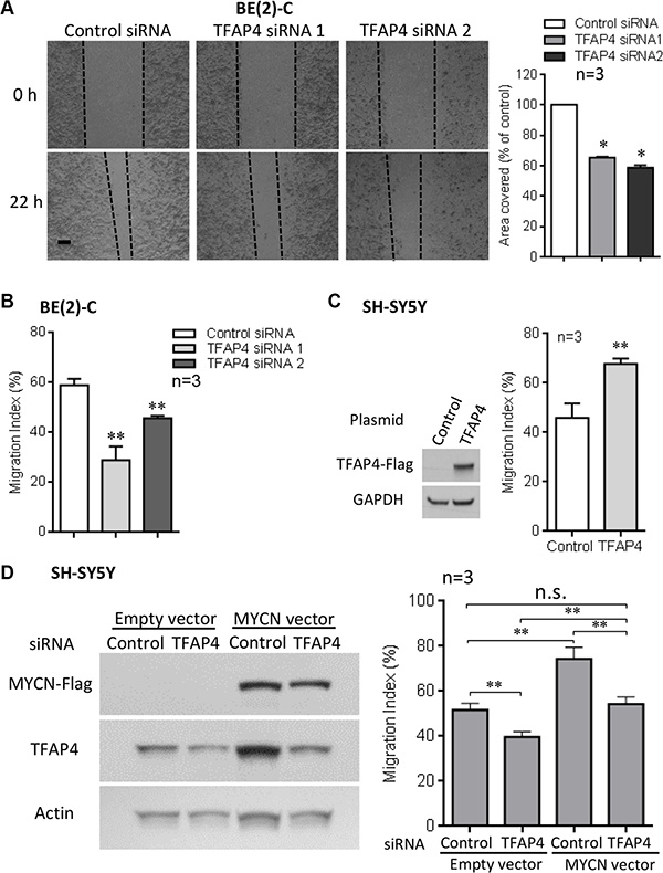 Figure 3: TFAP4 is required for neuroblastoma cell migration. Suppression of TFAP4 in BE(2)-C decreased cell motility in wound closure assays (A) (Scale bar 100μm). TFAP4 suppression decreased transwell migration (B). Overexpression of TFAP4 in MYCN-non-amplified SH-SY5Y cells increased migration (C). Transient overexpression of MYCN in SH-SY5Y cells increased migration, and depletion of TFAP4 abrogated this effect (D). Western blots demonstrated successful transfection of MYCN plasmid, TFAP4 plasmid or TFAP4 siRNA (C, D). Mean ± SE (n = 3). *P < 0.05, **P < 0.01.