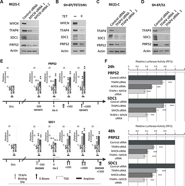 Figure 6: PRPS2 and SDC1 are direct transcriptional targets of MYCN and TFAP4 in neuroblastoma. (A–D) Western blots of PRPS2 and SDC1 expression in BE(2)-C and SH-EP/S1 48 h after suppression of MYCN or TFAP4 or 72 h after suppression of MYCN expression in SH-EP/TET21/N cells (n ≥ 2). (E) Quantitative ChIP assays on BE(2)-C cells. Fold enrichment is relative to the preimmune serum. Mean ± S.E. (n = 5) in which each region was amplified by qPCR in triplicate. Bent arrow: transcriptional start site (TSS); Dist. (Distal region); grey arrow: TFAP4 binding site; black arrow: E-box (MYCN binding site); black boxes: amplicons indicated with a capital letter. The chromosome and coordinates (bp) are provided. (F) Luciferase activity was determined following transfection of reporter constructs into BE(2)-C transfected with TFAP4 and/or MYCN siRNA, or control siRNA. ***P < 0.001.