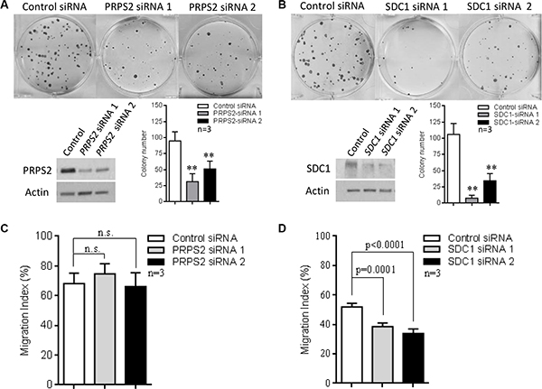 Figure 7: The role of PRPS2 and SDC1 in neuroblastoma progression. (A–B) Suppression of PRPS2 or SDC1 resulted in reduction of colony forming ability in BE(2)-C cells. (C–D) SDC1 suppression significantly decreased migration, while PRPS2 suppression showed no significant effect. Mean ± SD (n = 3), **P < 0.01.