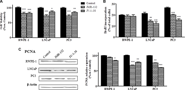Figure 1: Effect of GHRH antagonists, JMR-132 and JV-1-38, (0.1 μM) on cell viability (A), cell proliferation (B) and expression of PCNA in RWPE-1, LNCaP and PC3 cells. The outcome was evaluated by means of MTT (A), BrdU incorporation (B) assays and Western blot assays (C). The results are expressed as percentage of control value. Data are mean ± SEM of ten independent experiments; *p < 0.05; **p < 0.01; ***p < 0.001.
