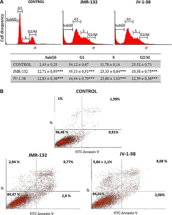 Figure 2: Analysis of cell cycle (A) and apoptosis (B) in PC3 cells after treatment with GHRH antagonists JMR-132 or JV-1-38. Cells were treated for 8 h (A) and 24 h (B) with 0.1 μM GHRH antagonists. The results are shown as percentage of cells in each phase of the cycle (A) and, early (Lower right) and late (Upper Right) apoptotic cells (B), as compared to untreated control cells. A representative experiment is shown. Data in the table are the means ± SEM of four independent experiments; ***p < 0.001 vs. control.
